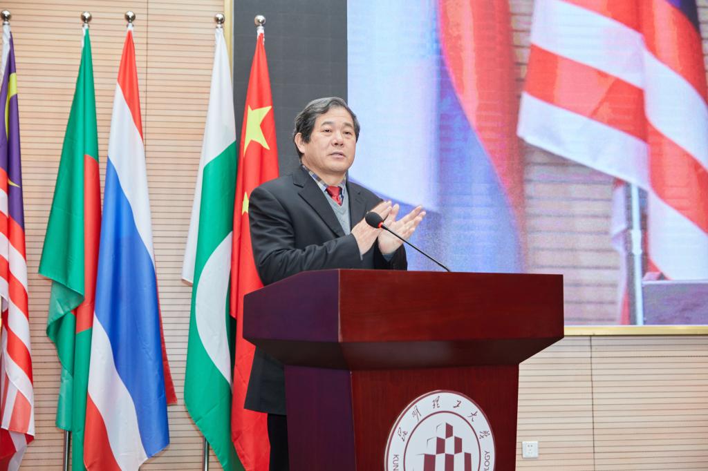 王华代表昆明理工大学向参加联盟成立仪式及高校校长论坛的嘉宾和高校代表表示欢迎,向长期以来致力于推动中国-南亚东南亚高校教育合作事业的专家和同仁表示感谢,相信“中国-南亚东南亚大学生友好运动会联盟”的成立,必将为联盟内各高校深化友谊、加深合作、实现共同进步,为各国青年学子深化文化、教育、体育交流提供良好的桥梁纽带。希望通过文化、体育这一“世界语言”,深化联盟各高校间的师生交流层次,丰富交流合作内容,为云南与南亚东南亚教育合作贡献昆工力量,为中国与南亚东南亚文明互鉴和民心相通注入新活力。