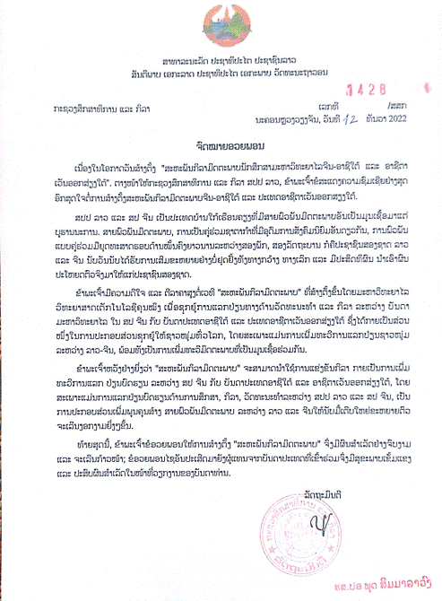 12月12日,老挝教育体育部部长普·西玛拉翁向昆明理工大学倡议成立的“中国—南亚东南亚国家大学生友好运动会联盟”致贺信,希望“联盟”能以体育比赛作为纽带,加强中国与南亚东南亚间,特别是老中两国教育、体育、文化等方面的交流,培养更多的老中友好使者,不断推进老中关系迈上新台阶。